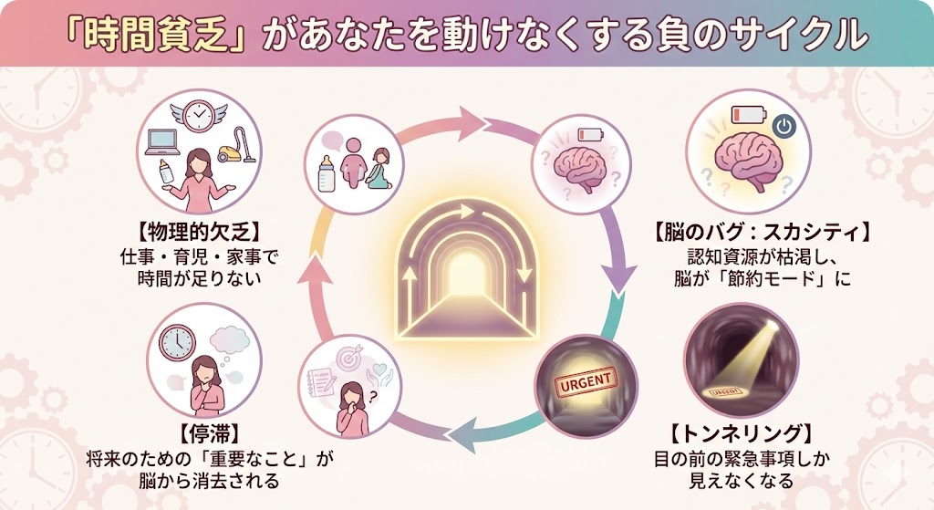 人は「時間が足りない」「余裕がない」と感じる状態が続くと、脳が欠乏状態(スカシティ)と呼ばれるモードに入ります。