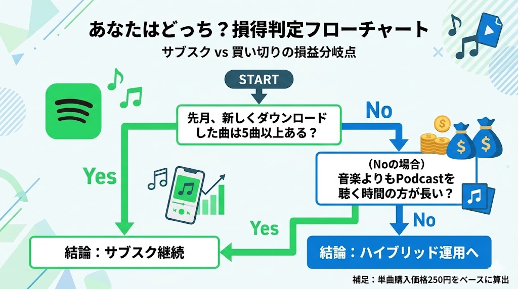毎月「使うかどうか分からない1,080円」を払い続けるのか、それとも「この曲は残しておきたい」と思ったときに250円を払うのか。